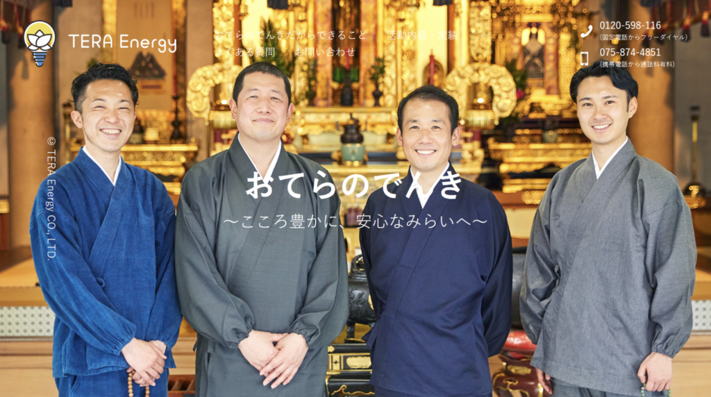 The new electricity company Tera Energy Co., Ltd. was founded in 2018 by four Buddhist priests in Kyoto City with Rev. Takemoto Ryogo serving as president. These priests were initially involved in suicide prevention with Sotto: the Kyoto Suicide Prevention Centre in Kyoto. Having seen the suicide issue as the tip of the iceberg of a myriad of social issues that have emerged with the downturn in Japan’s economy since the 1990s, these priests decided to work on a more holistic response.[1] We spoke to Tera Energy’s director, Rev. Tsuruno Koyu 霍野廣由 (38), a founding member and head of their new disaster prevention division, about their activities for “illuminating” society.